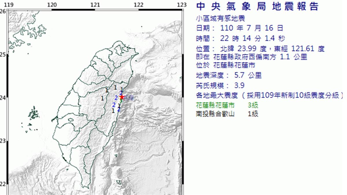 根據中央氣象局最新資訊,今晚10時14分發生芮氏規模3.9地震,地震深度5.7公里,震央位於花蓮縣政府西偏南方1.1公里(位於花蓮縣花蓮市),最大震度花蓮縣3級。