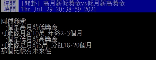 昨(29)日一名網友在PTT發文,他以「高月薪低獎金vs低月薪高獎金」為題,舉例有兩種職業可以選擇,一個是月薪10萬,年終2-3個月,另一個則是月薪5萬,分紅18-20個月,原PO在文末好奇詢問,「哪個比較有未來性」。