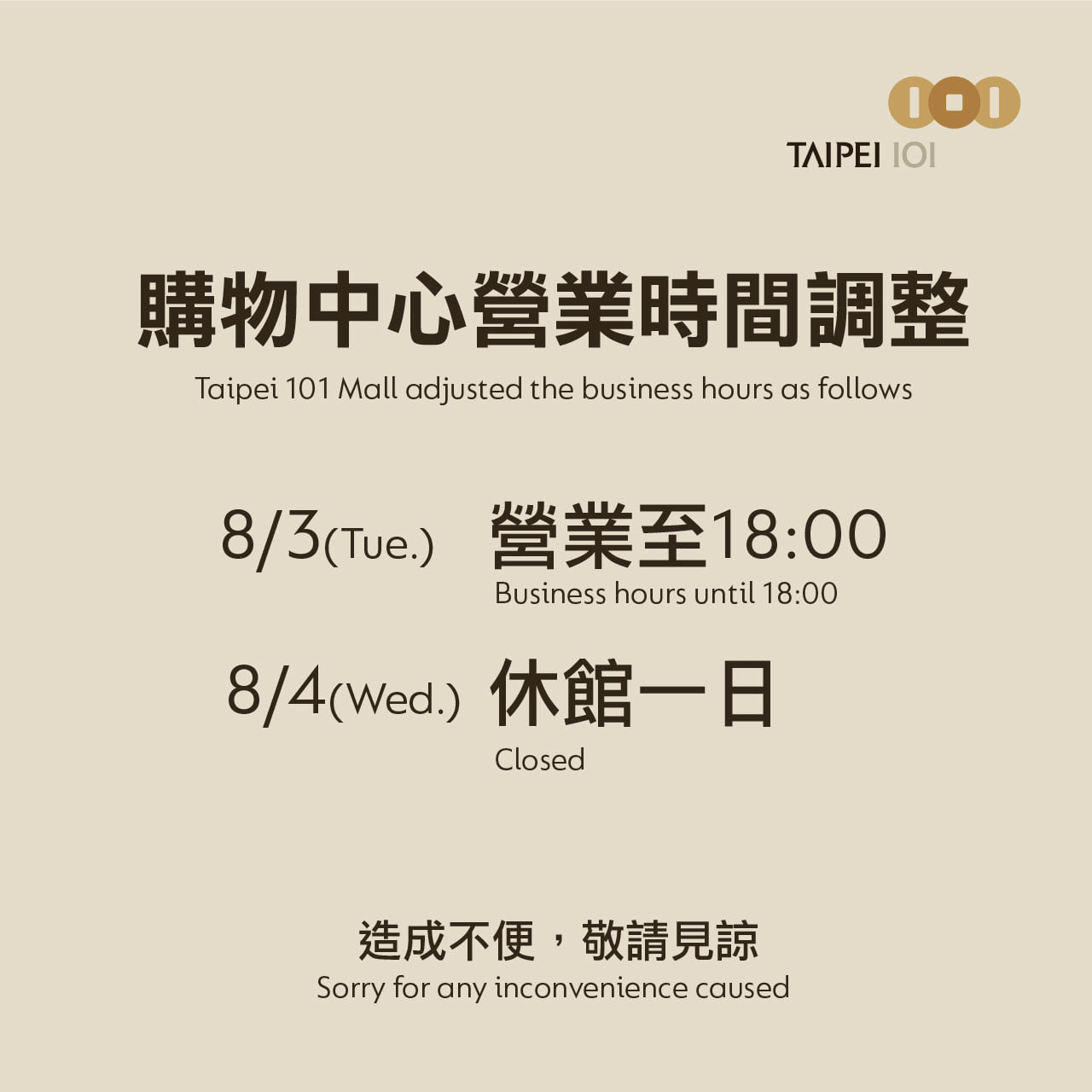 台北101購物中心在臉書發文指出,台北101購物中心今天(8/3)將提早於18:00閉館,明天(8/4)也將全日暫停營業,進行全館消毒,8/5(四)起正常營業,台北101遵守中央流行疫情指揮中心及台北市政府相關規定,持續做好最高標準的防疫措施,全力維護員工、租戶與顧客的健康與安全。