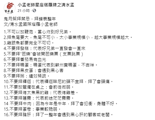 ▼鬼月拜拜的16個禁忌。(圖/翻攝自小孟老師星座塔羅牌之清水孟臉書)