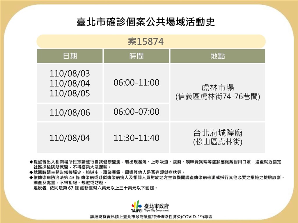 ▼台北市政府7日公布確診COVID-19的虎林市場雞肉攤商(案15874)足跡。(圖/台北市政府提供)