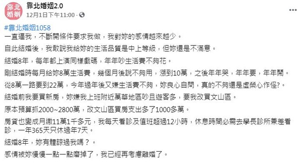 原PO在臉書社團「靠北婚姻2.0」發文透露,剛與妻子結婚時,他敢保證給對方的生活品質絕對是中上等級,且每月還給她8萬元的生活費,不過,妻子嫌這筆錢根本不夠用,而疼愛對方的原PO決定先把生活費漲到10萬元,妻子仍不知足,「之後年年哭、年年要、年年鬧,從8萬一路漲到22萬」,到了今年妻子又獅子大開口,要他再加碼,讓他氣到直呼「妳良心自問,是真的不夠用還是虛榮心作怪?」