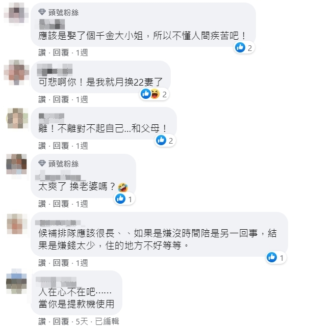 原PO這段悲慘的婚姻故事一曝光,讓許多網友看了紛紛開勸,「贊成離,人在福中不知福,不懂珍惜不適合在一起」、「你不放生,是打算讓她幫你領喪葬補助嗎」、「她愛的是你的錢而已,這個伴可以不要了」、「別人的老公真的完全不讓人家失望」、「如果真心愛你會想跟你一起存錢,而不是每個月每年要錢,而且還越來越多」。