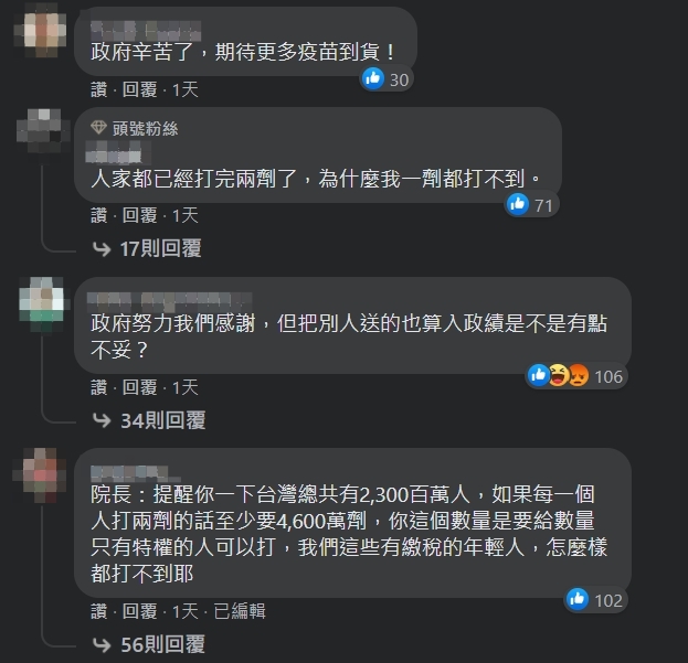 行政院長蘇貞昌對此在網路發文,有網友感謝也有人開酸,說人家都已經打兩劑,為什麼自己一劑都打不到,一千多萬劑,連第一劑都沒排到,還有人說1038萬劑,自己一滴也分不到。這個情形,讓排不到疫苗的年輕人特別有感。
