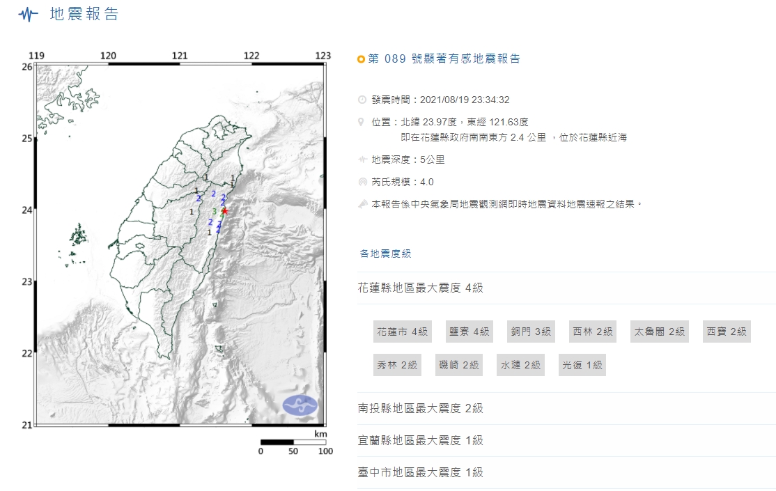 昨天深夜11時34分,再度發生芮氏規模4.0地震,地震深度5.0公里,南南東方 2.4 公里 ,位於花蓮縣近海,最大震度花蓮縣4級。
