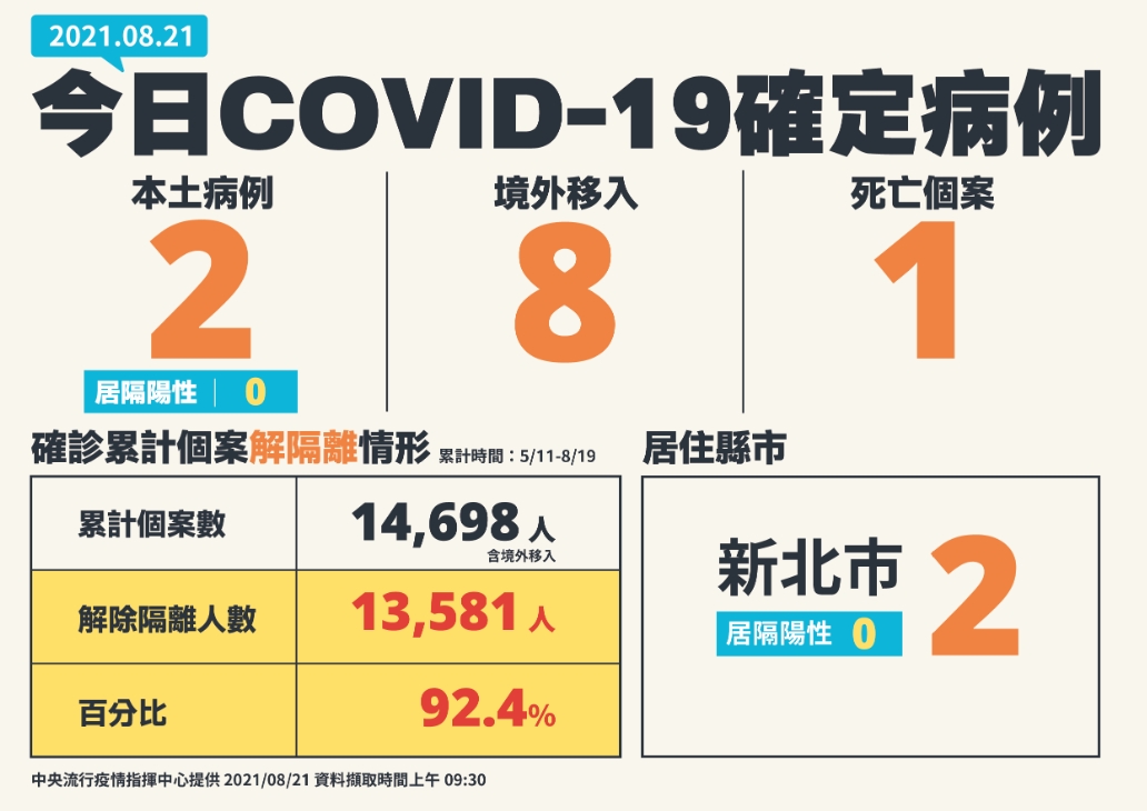 指揮中心表示,今日新增之2例本土病例(均非居家隔離期間檢驗陽性者),為新北市40多歲男性及50多歲女性,分別於8月16日及8月19日發病;其中1例關聯不明、1例疫調中,將持續進行疫情調查,以釐清感染源。