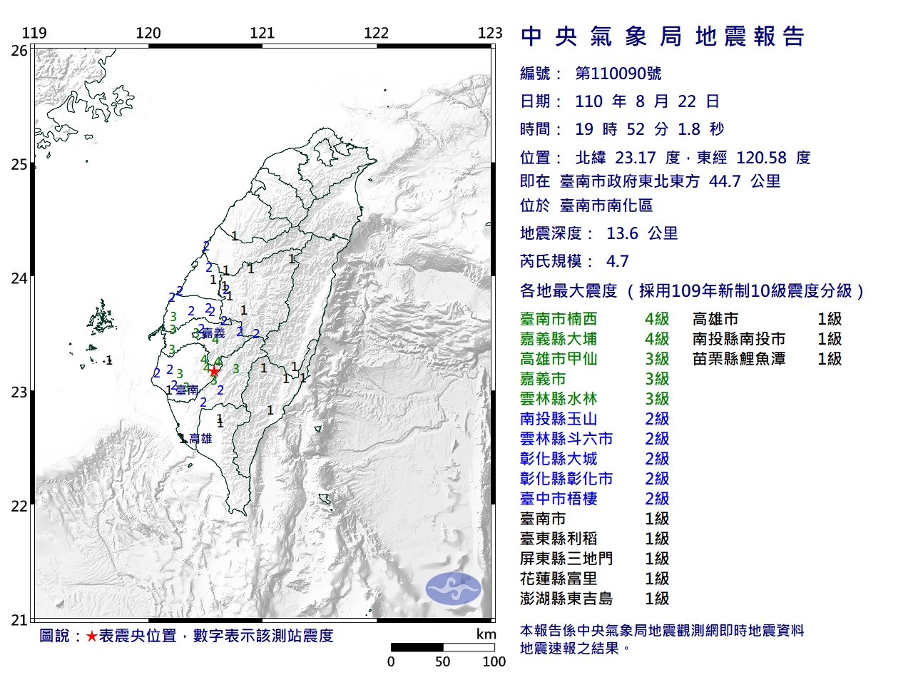 今日19時52分左右南部地區附近發生規模4.7有感地震,震央在台南市南化區深14km,南4嘉4高3雲3投2彰2中2東1屏1花1澎1苗1。
