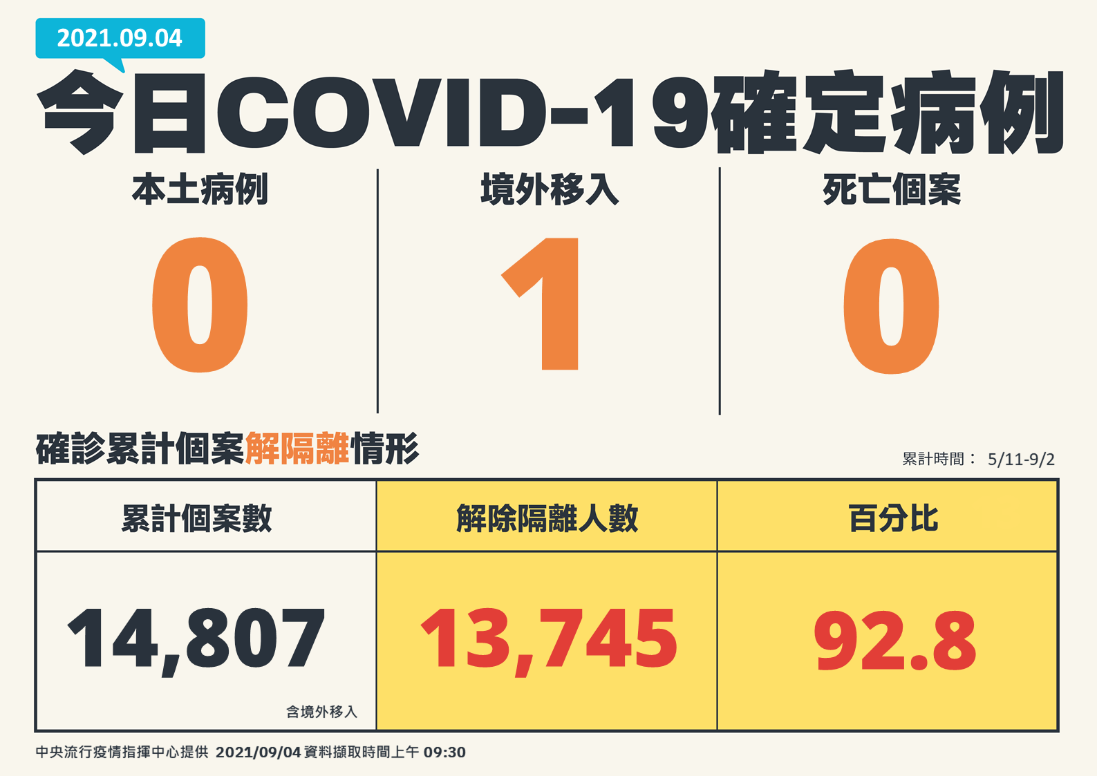 指揮中心指出,近期確診個案解隔離情形,5月11日至9月2日累計公布14,807位確診個案中,已有13,745人解除隔離,解隔離人數達確診人數92.8%。