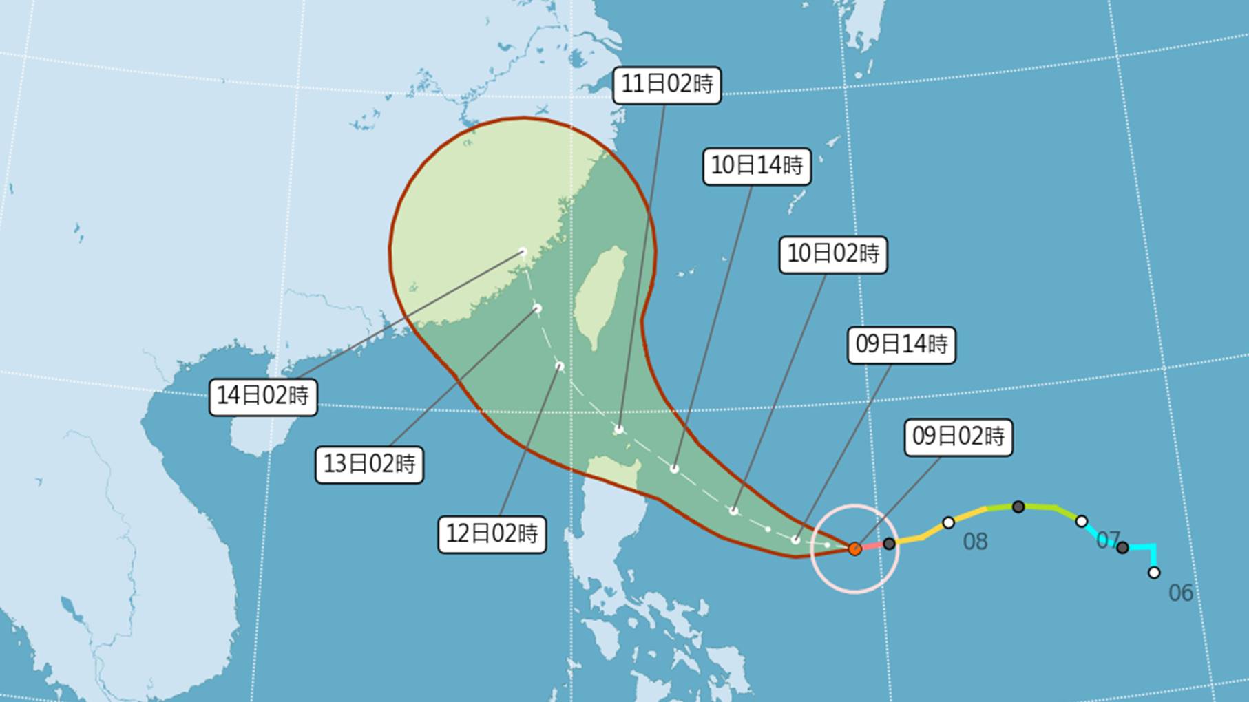 ▲▼強颱「璨樹」」行進速度加快,可能提前北轉。(圖/翻攝自中央氣象局)