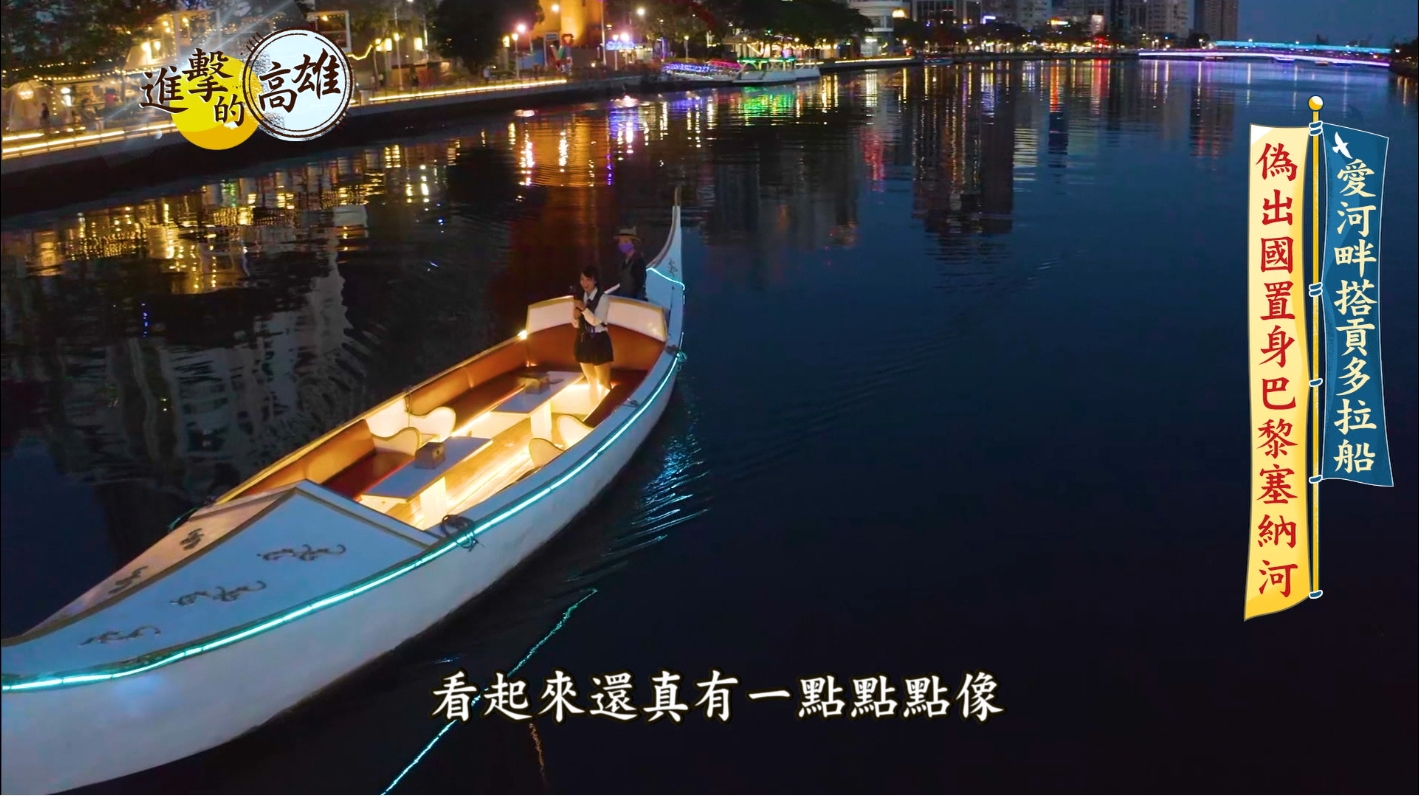 一路玩到晚上,絕對不能錯過的夜間美景,就是愛河啦!看著湖畔燈光點點,還真的有點巴黎塞納河畔的意象。謝佑昀搭乘愛河版,獨家的貢多拉船,一邊聽著船伕小姐的歌聲,一邊介紹愛河的歷史。原來愛河早期叫做高雄川,是日據時期重要的交通樞紐,是民國37年時,一間愛河遊船在此地經商,加上有不少情侶來河邊談情說愛,才漸漸被稱為愛河。搭上全台獨家的貢多拉船更是彷彿置身浪漫水都威尼斯,這樣偽出國的體驗在無法出國旅行的現在實屬一種奢侈的享受。