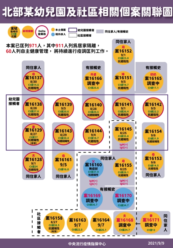 至於國內新增的4本土個案中,為3例男性、1例女性,其中包含一對板橋社區的裝修夫妻,這4例個案年齡介於30歲至50多歲,其中1例發病日為今(2021)年9月5日、餘3例為無症狀感染;個案分布為臺北市及新北市各2例,其中3例為已知感染源、1例關聯不明,衛生單位將持續進行疫情調查及防治,以釐清感染源。