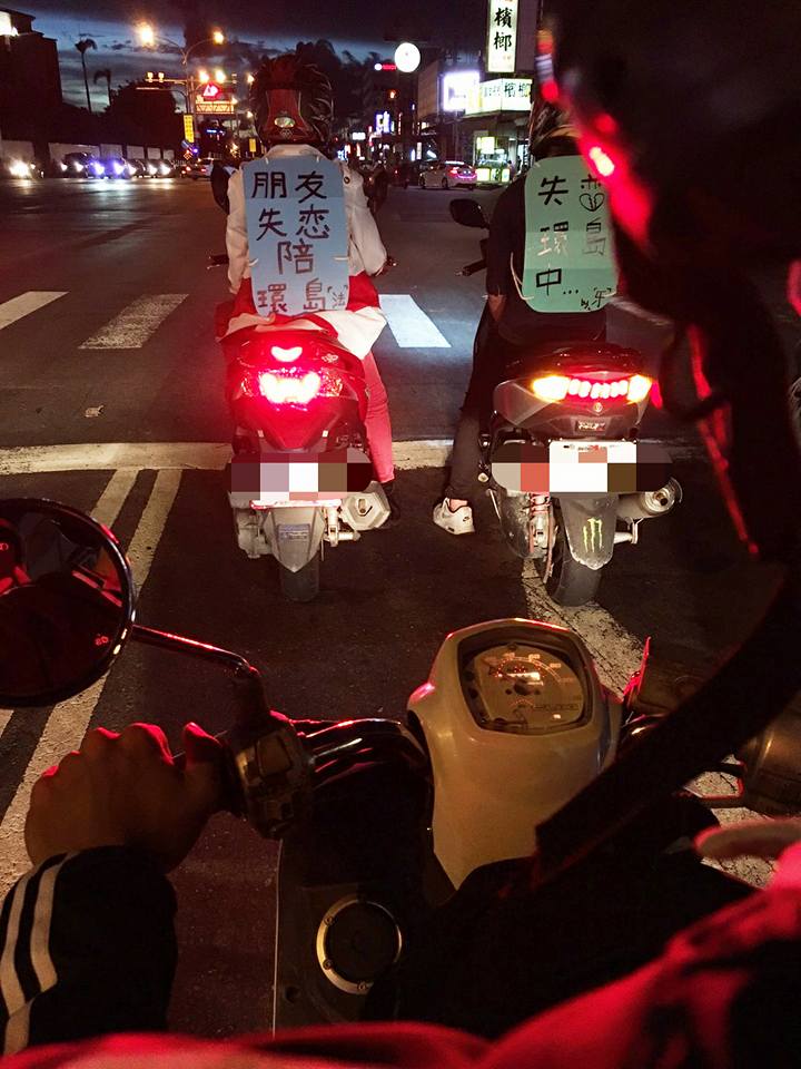 一名網友在臉書「爆料公社」PO文,指出自己在高雄岡山前往路竹的路上,停紅綠燈時,看見了前方的2位騎士,背著醒目的牌子,一個寫著「失戀環島中」,在旁的朋友則寫著「朋友失戀陪環島」,看到這樣的情景後也讓原PO忍不住表示,「覺得燃燒了熱血魂,失戀無罪、友情萬歲」,最後也想和他們說聲,「加油囉!」