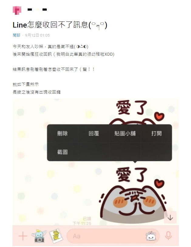 一名網友在「Dcard」上發文表示,自己在跟朋友吵架之後,開始瘋狂收回訊息,結果到才弄到一半,功能卻突然消失,長按後完全沒跳出收回的選項,其他複製、刪除、回覆、截圖等功能都還在。原PO感到十分緊張,連忙上網搜尋相關訊息,一查之下才發現原來是有時間限制,只要超過24小時,訊息就無法收回,最後利用自己的親身經歷,溫馨提醒網友,要注意傳訊息的時間,否則超過最後時限,那麼一切就來不及了。