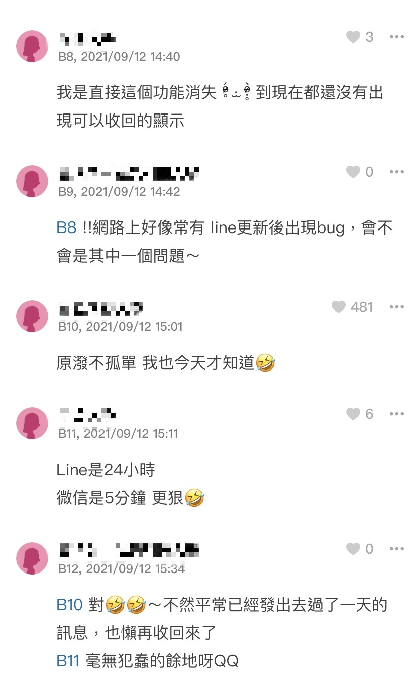 貼文一曝光,許多網友在底下留言表示,「我是直接這個功能消失,到現在都還沒有出現可以收回的顯示」、「24小時算好了,微信超過2分鐘就不能收回」、「我今天才知道欸!居然還有限時間」、「就算你收回,對方可能也還是看得到,要在發出去後很快收回對方才看不到」。