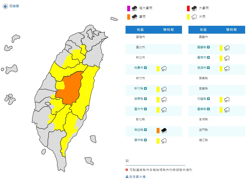 中央氣象局今天下午發布豪雨特報,午後對流發展旺盛,易有短延時強降雨,在短時間內降雨猛烈。南投縣山區有局部大雨或豪雨,花蓮、南投地區及高雄以北、東北部、東南部山區有局部大雨發生,請注意雷擊、強陣風及溪水暴漲。
