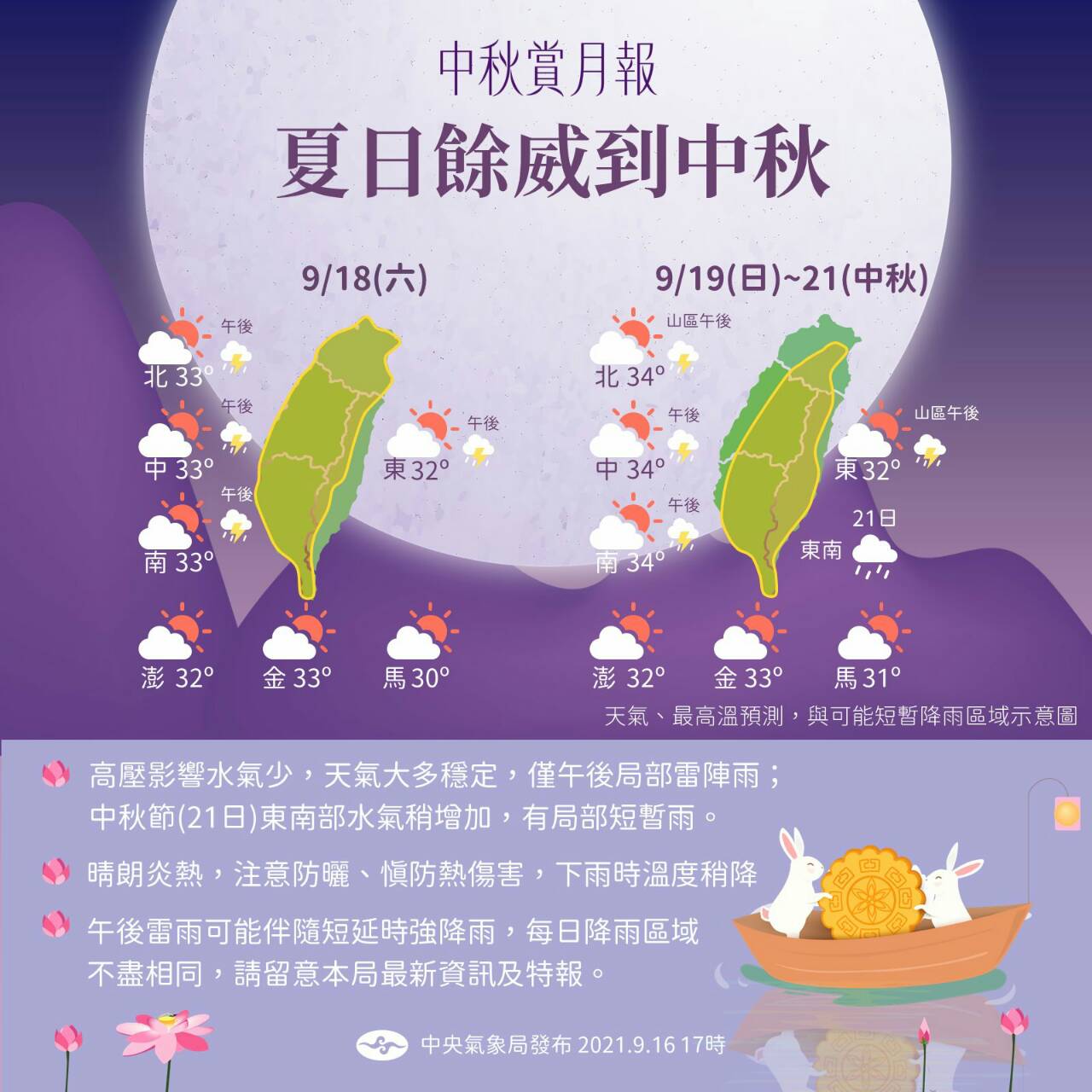 ▼中秋節連假天氣出爐。(圖/中央氣象局)