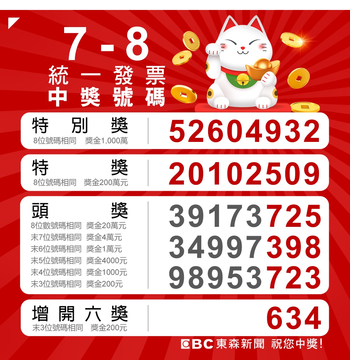 又到了統一發票開獎日!本期(110年7-8月)千萬特別獎號碼是52604932,快檢查錢包裡的發票,看看自己是不是被財神爺眷顧的幸運兒!上一期5-6月統一發票號碼中獎者,一共有12位千萬得主,甚至有7位民眾花不到100元就抱走千萬。此外,本次統一發票增開一組六獎號碼,讓更多人有機會得到200元小確幸,而財政部也提醒,7、8月期統一發票的領獎期限為今年10月6日至明年1月5日。