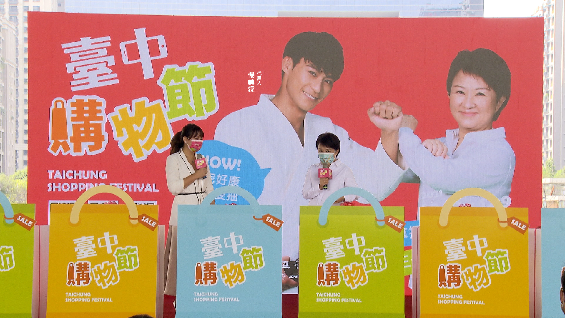 柔道選手楊勇緯合體台中市長盧秀燕喊話:「全台最大購物節開跑囉,台中購物節,一起購物去。」