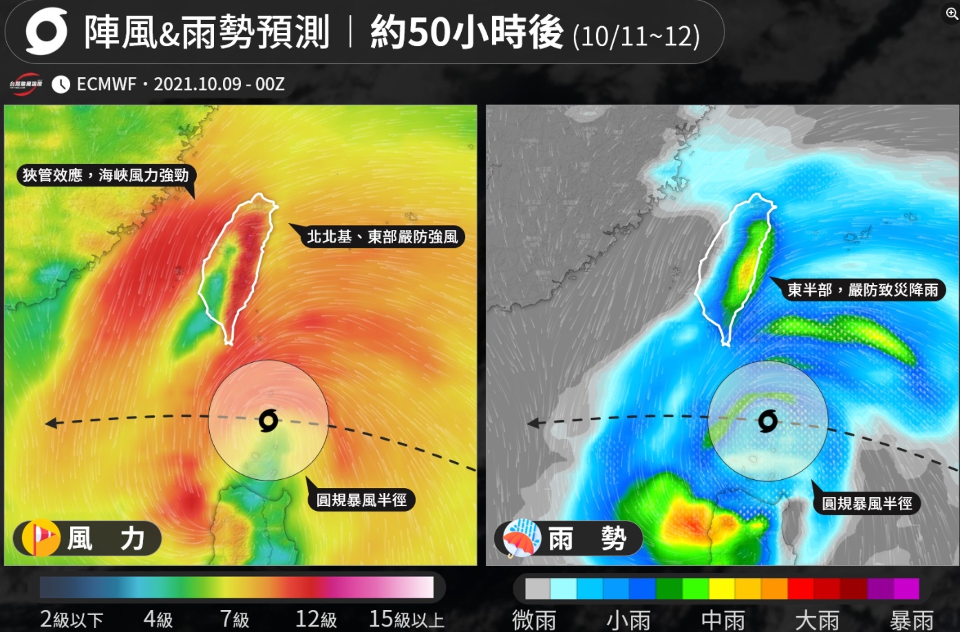 儘管颱風不直撲,但後續的影響反而更大,「台灣颱風論壇|天氣特急」表示,颱風「圓規」的內部持續低壓混戰中,強度已經不是重點,需要關注的反而是超大的環流範圍,以及「內弱外強」的季風低壓特徵,因為這直接導致了,即使暴風圈預測不會碰到(或摸到恆春),但颱風最強的部份,卻會侵襲台灣!