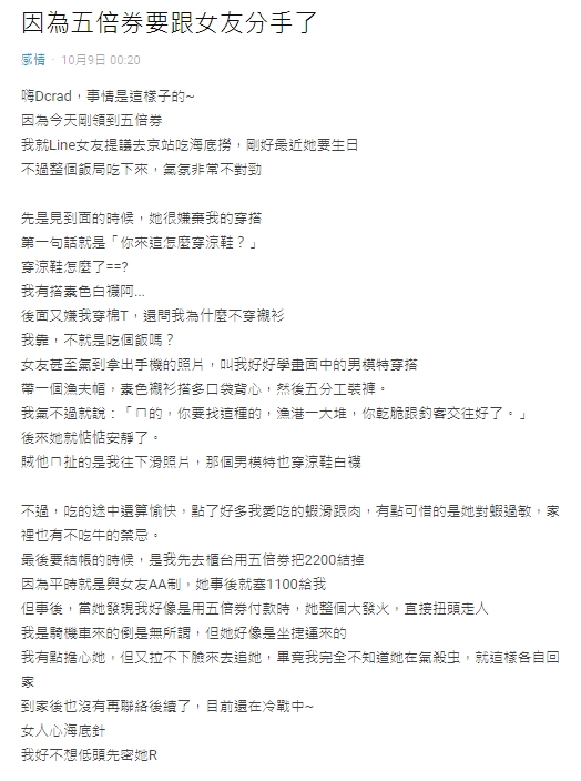 用完餐結帳時,原PO先到櫃台使用五倍券將餐費2200元付清,因2人是AA制的關係,所以女友塞了1100元給原PO,但女友卻發現原PO是使用五倍券付款,整個人直接生氣轉頭就走,讓他相當無奈,並表示自從到家後,對方就沒有和他聯繫,讓原PO忍不住感嘆「女人心海底針」,並將整個過程發到社群軟體。