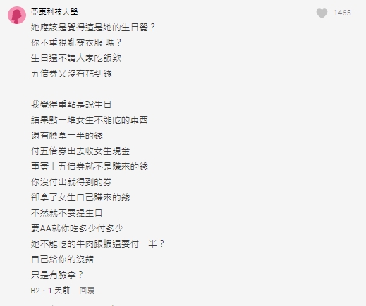 不少人看到文章後,紛紛在底下提出自己的看法,有人認為他並沒有尊重女友,認為如果原PO重視女友的生日,就不應該在重要的日子裡,亂穿衣服,更表示「結果點一堆女生不能吃的東西,還有臉拿一半的錢,付五倍券出去收女生現金,事實上五倍券就不是賺來的錢,你沒付出就得到的券,卻拿了女生自己賺來的錢」。