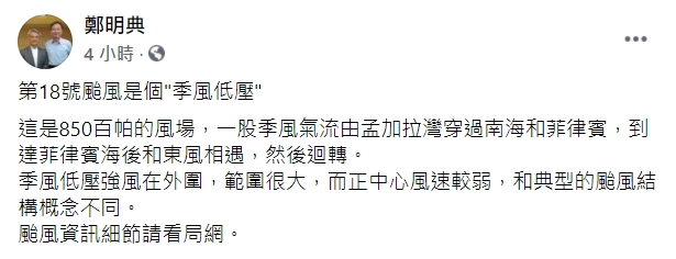 鄭明典說,季風低壓強風在外圍,範圍很大,而正中心風速較弱,和典型的颱風結構概念不同。