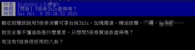 紙本五倍券8日開放第一梯次領券,不少民眾也陸續開始使用,不過還是有很多人不知道要用在哪裡。PTT上就有一名網友指出,昨(9)日他收到一封簡訊,上面寫著「用5倍券消費可享台妹2h2s,加殘廢澡、精油按摩、口O、毒OO……」原PO則指出,自己完全看不懂這些是什麼意思,但想問問看大家「5倍券買這些值得嗎?」