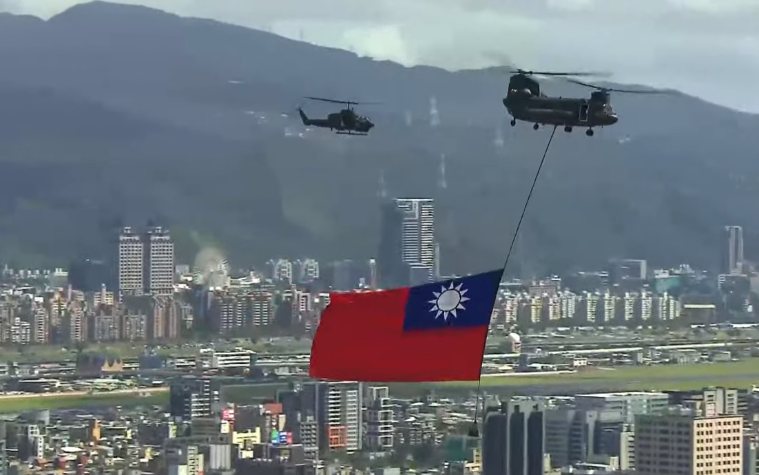 今年國慶大典在演唱國歌時,由國軍CH-47直升機吊掛曆年國慶典禮以來,最大最吸睛的巨幅國旗,飛越總統府前廣場上空。這面國旗重達45公斤旗,就連飛行速度都要精算,才能在空中展現最好的效果。包括空勤總隊,今天一共有47架12型機飛越台北上空。