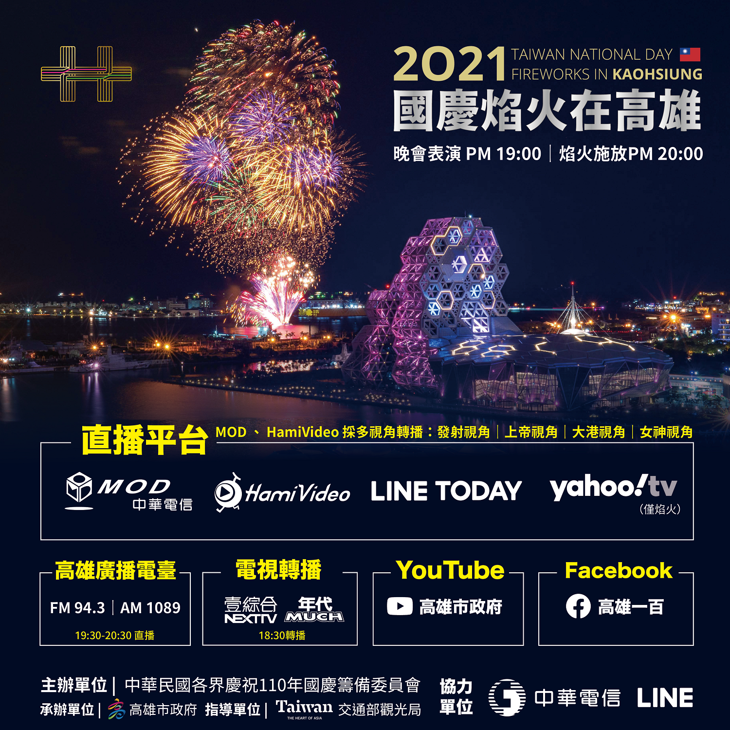 2021國慶焰火於今(10)日晚間在高雄港區施放,預計施放約30分鐘,焰火近2萬發、12吋及16吋大口徑高空焰火彈達百發以上,由於入場民眾皆採預約制,因此觀光局也另外公布了15處觀賞國慶焰火地點,包括哈瑪星鐵道園區、西子灣遊客中心、打狗英國領事館文化園區、旗津輪渡站周邊、旗津沙灘、星光水岸公園、旗津風車公園、駁二藝術特區、高雄流行音樂中心、國立中山大學、夢時代周邊、83期重劃公園、旗津漁港周邊、壽山情人觀景台暨忠烈祠周邊、西子灣觀景平台。