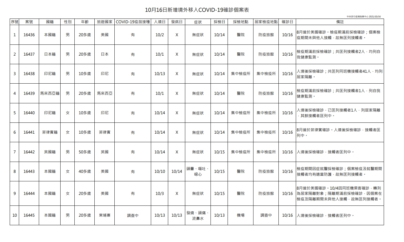 指揮中心說明,今日新增10例境外移入個案,為6例男性、4例女性,年齡介於10多歲至50多歲,分別自美國(3例,案16436、案16443、案16444)、日本(案16437)、印尼(2例,案16438、案16440)、馬來西亞(案16439)、菲律賓(案16441)、英國(案16442)及柬埔寨(案16445)入境,入境日介於10月1日至10月14日,皆持有搭機前3日內檢驗陰性報告。