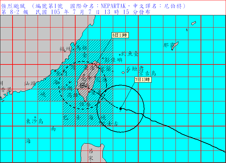 根據最新颱風警報單,尼伯特目前在花蓮的東南方約350公里之海面上,7級暴風半徑200公里,以每小時18轉14公里速度,向西北西朝台灣而來。不過由於移動速度變慢,所以暴風圈預計今天傍晚5時到6時左右接觸東部陸地,而影響台灣的時間也會拉長。此外,尼伯特行徑路線有稍為南偏,預測颱風中心將會明天清晨5時到6時在台東登陸。