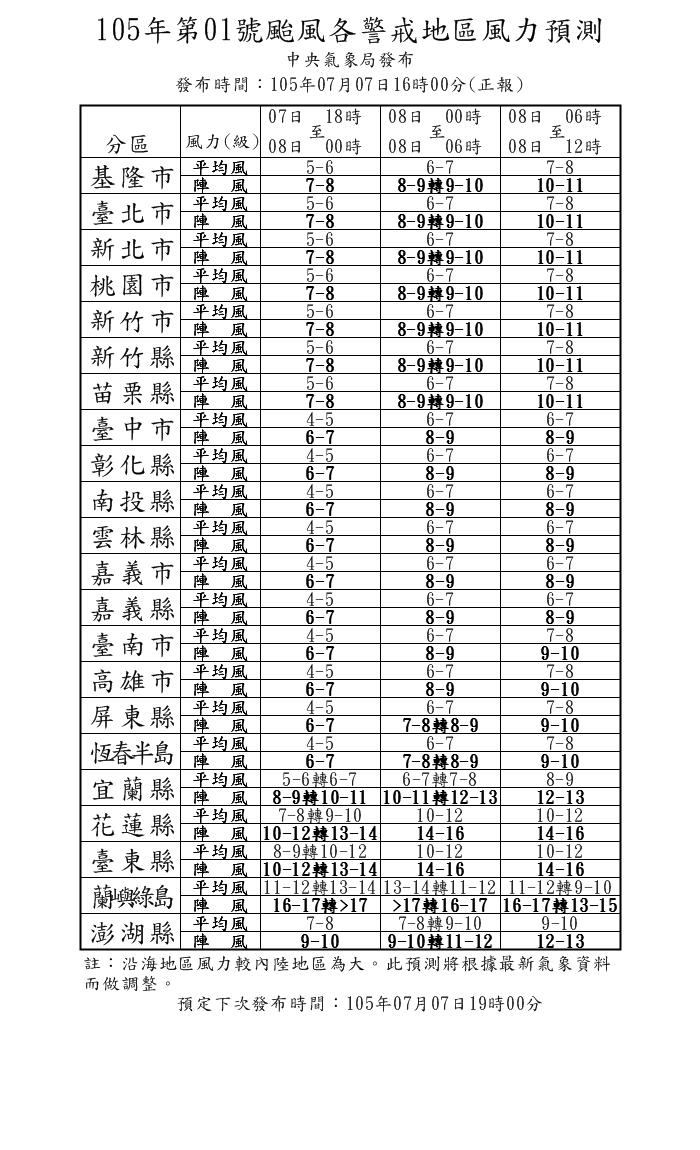 若依據中央氣象局所預測的風力預測表,8日時基隆市、台北市、新北市、桃園市、新竹市、新竹縣、苗栗縣、台南市、高雄市、屏東縣、恆春半島、宜蘭縣、花蓮縣、台東縣、蘭嶼綠島、澎湖縣以上14區域已達到停班停課的標準。但會不會停班停課還是依照行政院人事行政總處所公布的資訊為準。