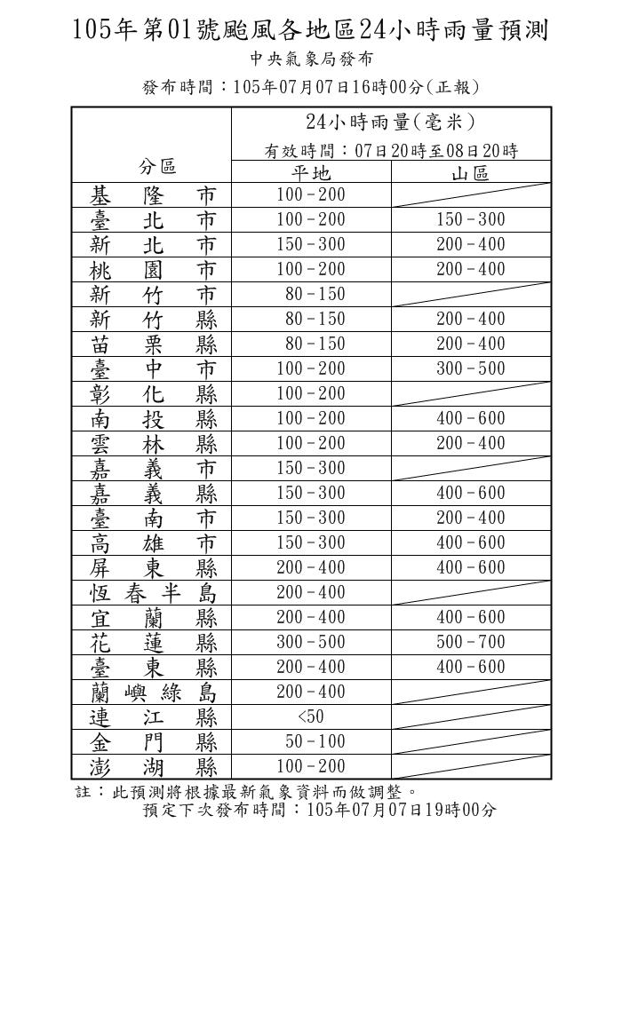 另外降雨部分,目前預測從今日晚間20時至8日晚間20時這24小時內,台灣北、中、南部及連江、金門、澎湖地區平地將會有平均200至300毫米的降雨量,山區則平均400到500毫米。但是屏東、恆春半島、宜蘭、花蓮、台東、蘭嶼綠島則有高達400至500毫米的降雨量,山區更會降600至700毫米。所以請民眾務必多加注意,嚴防豪雨,並在家戒備防颱,切勿到沿海等地區,以免發生危險。