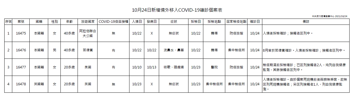 指揮中心說明,今日新增4例境外移入個案,為1例男性、3例女性,年齡介於20多歲至40多歲,分別自阿拉伯聯合大公國(案16475)、菲律賓(案16476)、美國(案16477)及英國(案16478)入境,入境日介於今(2021)年10月10日至10月23日,皆持有搭機前3日內檢驗陰性報告;詳如新聞稿附件。