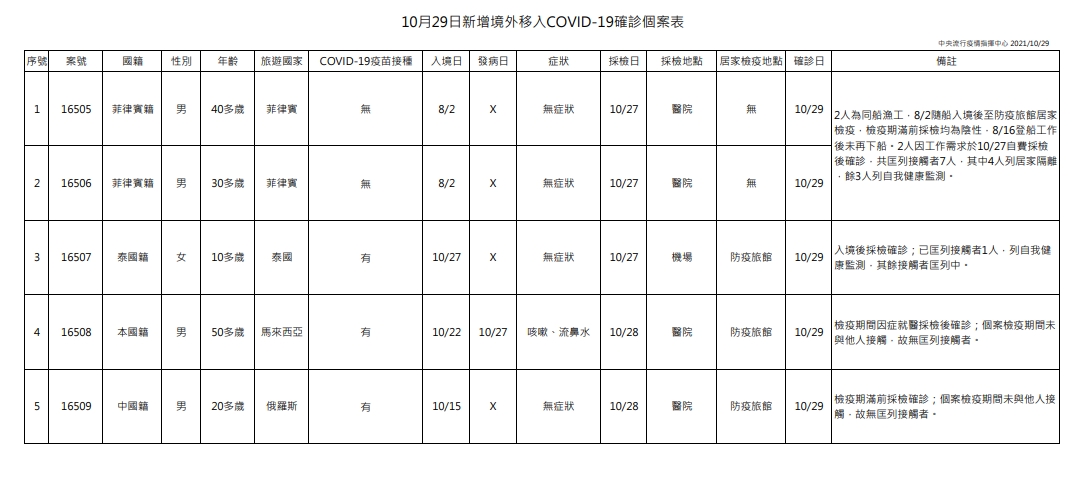 指揮中心說明,今日新增5例境外移入個案,為4例男性、1例女性,年齡介於10多歲至50多歲,分別自菲律賓(2例,案16505、案16506)、泰國(案16507)、馬來西亞(案16508)及俄羅斯(案16509)入境,入境日介於今(2021)年8月2日至10月27日;詳如新聞稿附件。
