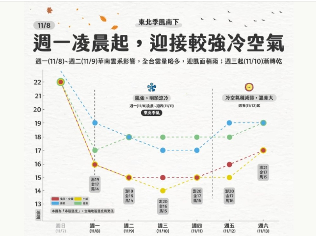 氣象局指出,12、13日(週五、六)輻射冷卻效應減少,清晨氣溫會稍微回升,不過受到東北季風影響,北部、東北部及東部整天仍較涼,其他地區則是早上晚上涼,此外,由於中層水氣持續增多,除東半部有局部短暫雨外,12日基隆北海岸、中部以北山區有局部降雨,降雨範圍在13日會擴大至北部平地,南部及中部平地則維持多雲到晴。至於氣溫什麼時候回升,氣象局預估,14日(週日)開始,東北季風會稍微減弱,白天氣溫會稍微回升,但早晚天氣仍較涼,趙竑指出,受東北季風增強影響,下波冷空氣將在18日(下週四)報到,至於鋒面對台灣的影響則不明顯。