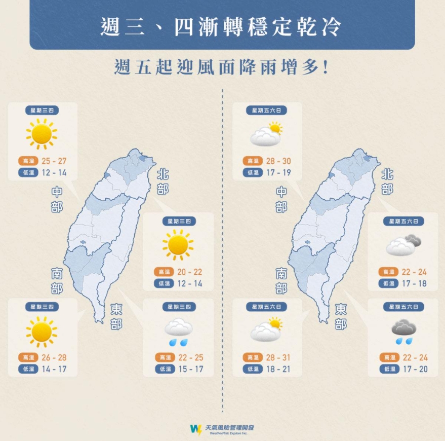 ▼這波冷空氣最冷時間點已過,週三起轉為乾冷。(圖/翻攝自天氣即時預報臉書)