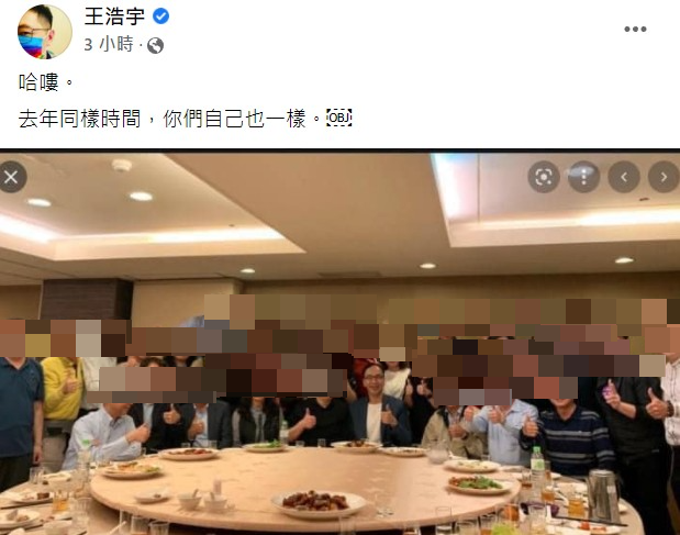 王浩宇今日在臉書PO出一張朱立倫與眾人的大合照,「哈嘍。去年同樣時間,你們自己也一樣。」照片只見同桌有35人,全部都沒戴口罩,對著鏡頭開心比YA,看得出來現場氣氛相當熱絡。而根據《中時》報導,這張照片其實是朱立倫今年3月27日與新北市舊屬餐敘,當時新北市長侯友宜和高雄市前副市長李四川未到場,外界還質疑侯友宜缺席是有意切割朱立倫,他事後還為此澄清,當天是因為有公事在身才無法到場。