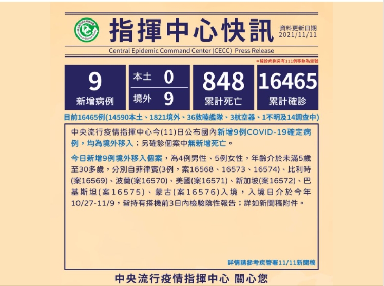 指揮中心接著說明,今日新增9例境外移入個案,有4例男性、5例女性,年齡介於未滿5歲至30多歲,分別自菲律賓(3例,案16568、16573、16574)、比利時(案16569)、波蘭(案16570)、美國(案16571)、新加坡(案16572)、巴基斯坦(案16575)、蒙古(案16576)入境,日期介於今年10月27日至11月9日,9例個案皆持有搭機前3日內檢驗因性報告。
