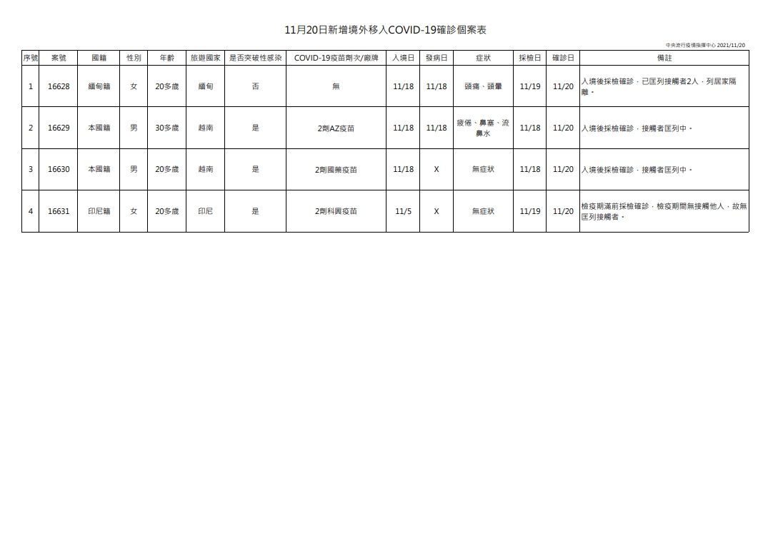 指揮中心說明,今日新增4例境外移入個案,為2例男性、2例女性,年齡介於20多歲至30多歲,分別自緬甸(案16628)、越南(2例,案16629、案16630)、印尼(案16631)入境,入境日介於今(2021)年11月5日至11月18日。
