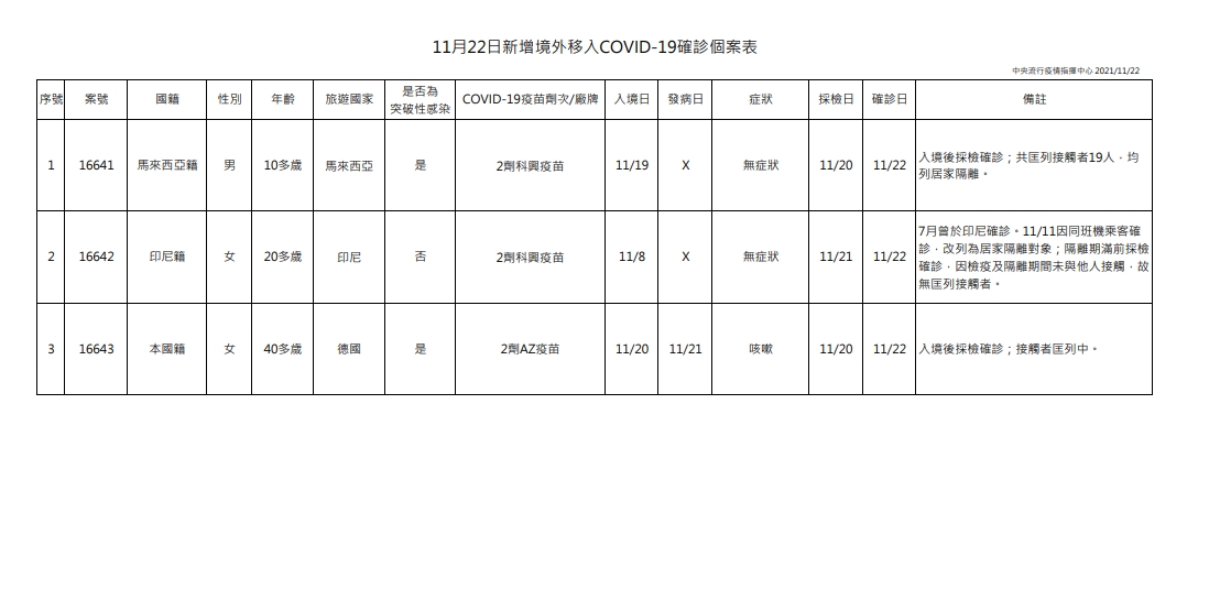 指揮中心說明,今日新增3例境外移入個案,為1例男性、2例女性,年齡介於10多歲至40多歲,分別自馬來西亞(案16641)、印尼(案16642)及德國(案16643)入境,入境日介於今(2021)年11月8日至11月20日,皆持有搭機前3日內檢驗陰性報告。