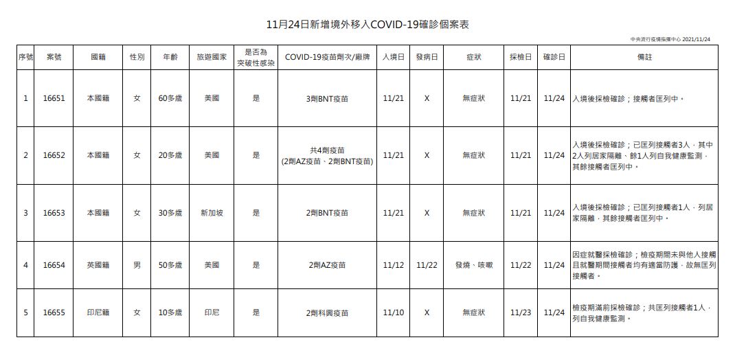 指揮中心說明,今日新增5例境外移入個案,為1例男性、4例女性,年齡介於10多歲至60多歲,分別自美國(3例,案16651、案16652、案16654)、新加坡(案16653)及印尼(案16655)入境,入境日介於今(2021)年11月10日至11月21日,皆持有搭機前3日內檢驗陰性報告。