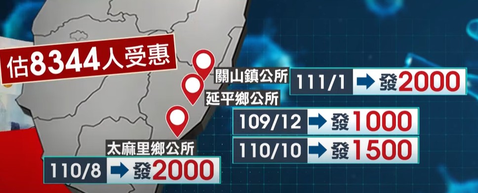台東縣延平鄉公所去年12 跟今年十月,二度發放共2500元,太麻里鄉公所今年八月則是發放2000,現在還有關山鎮公所預計明年將發2000元,估計會有8344人受惠 ,還傳出有人想要遷戶口。