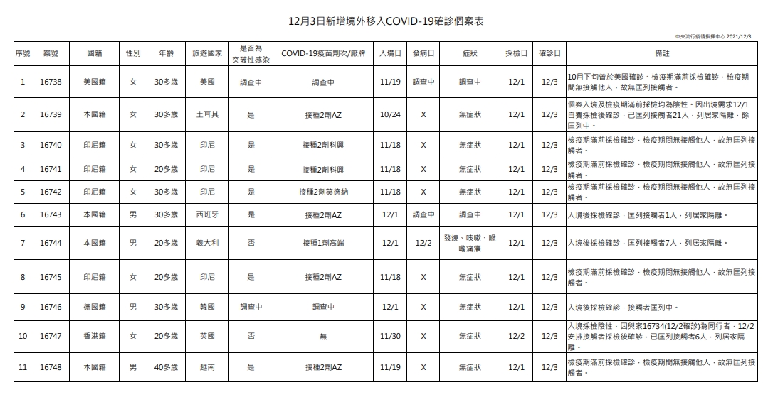 指揮中心說明,今日新增11例境外移入個案,為4例男性、7例女性,年齡介於20多歲至40多歲,分別自美國(案16738)、土耳其(案16739)、印尼(4例,案16740-案16742、案16745)、西班牙(案16743)、義大利(案16744)、韓國(案16746)、英國(案16747)及越南(案16748)入境,入境日介於今(2021)年10月24日至12月1日。