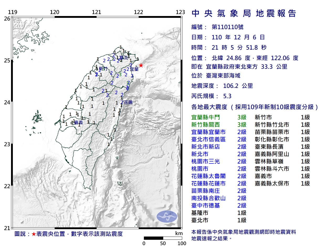 今(6)日晚間9點05分北台灣發生規模5.3有感地震,台北明顯搖晃有感,氣象局指出震央位在台灣東部海域深106km,至於震度則是宜3竹3北2桃2花2苗2投2中2彰1東1嘉1雲1。