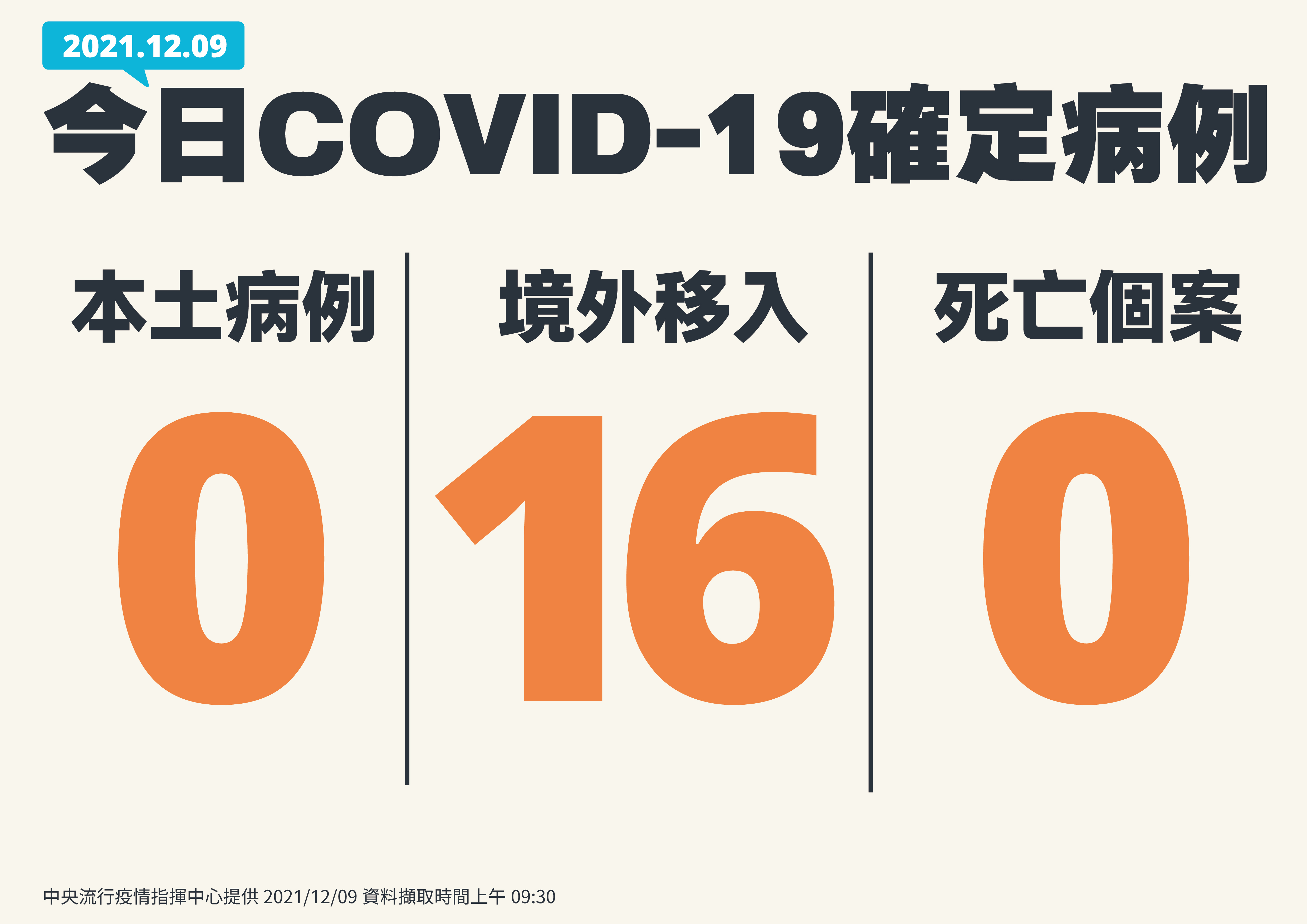 中央流行疫情指揮中心今(9)日公布國內新增16例COVID-19境外移入確定病例;另確診個案中無新增死亡。