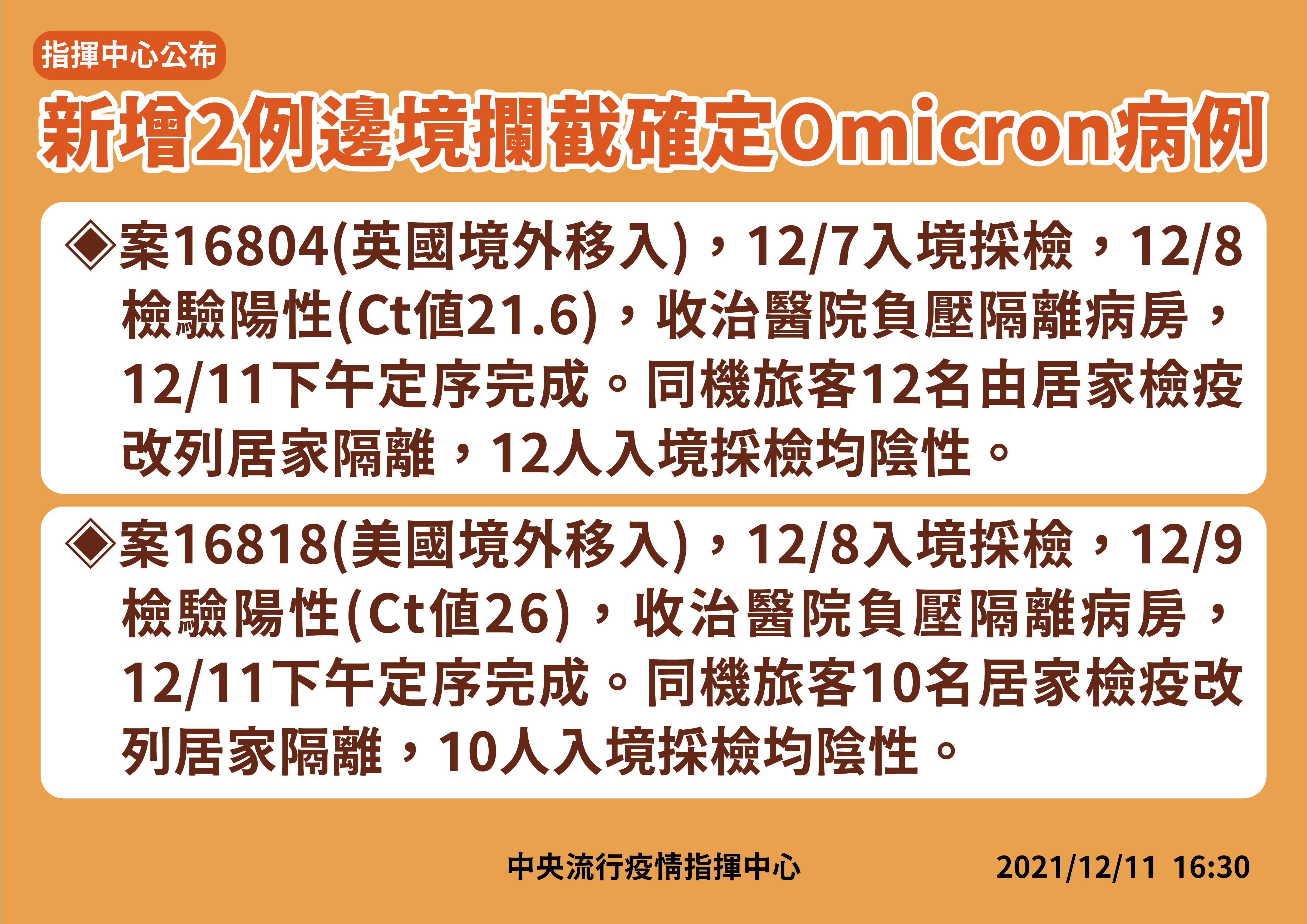 指揮中心於今(11)日記者會宣布邊境攔截到一例Omicron境外移入,沒想到下午時又公布攔截到新2例Omicron境外移入,一例是案16804由英國來台,另外一起則是從美國抵台,現在都收治在負壓隔離病房,而同機旅客也從居家檢疫改列居家隔離,也就是目前台灣共有3例Omicron境外移入。