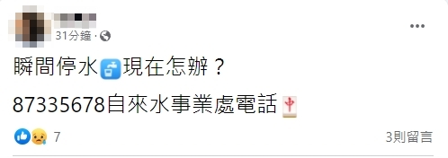 對此,根據《ETtoday新聞雲》報導,北水處回應,因受到萬隆變電所起火,導致部分地區停電停水,目前停水部分已經陸續恢復,如果民眾發現住家的水依舊未恢復,須自行重啟電源。