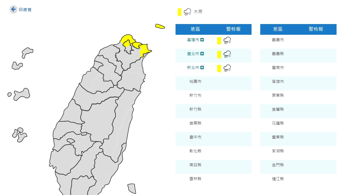 ▼氣象局針對北北基發布大雨特報。(圖/翻攝自中央氣象局)