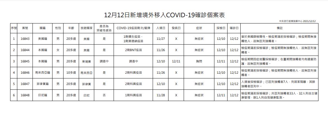 指揮中心說明,今日新增6例境外移入個案,為5例男性、1例女性,年齡介於10多歲至20多歲,分別自美國(2例,案16843、案16844)、柬埔寨(案16845)、馬來西亞(案16846)、菲律賓(案16847)及印尼(案16848)入境,入境日介於今(2021)年11月26日至12月10日;詳如新聞稿附件。